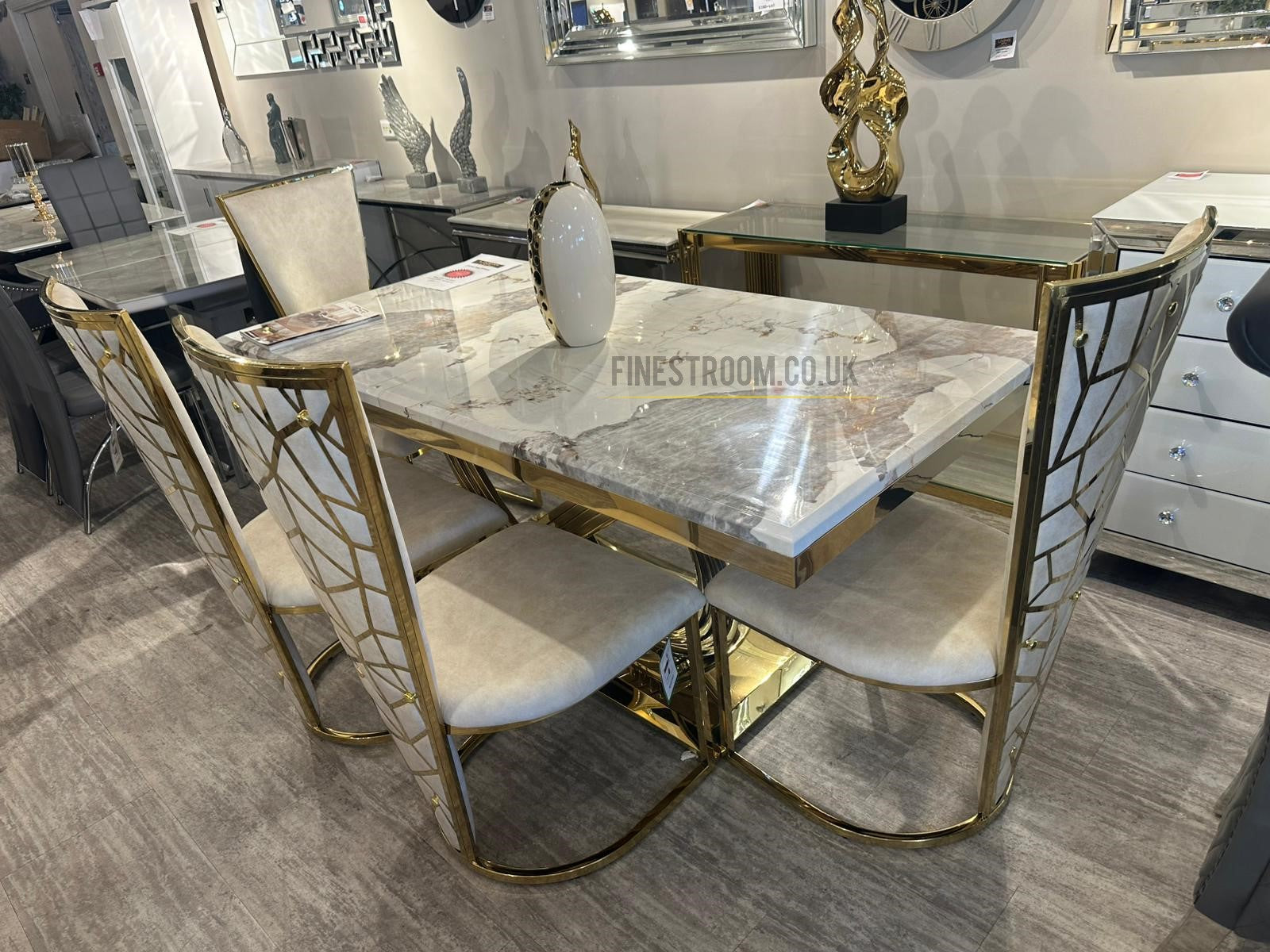 Create a lavish and inviting dining experience with the 1.8m Pandora Elina Gold Table paired with Cream Gold Vienna Chairs. This exquisite set showcases a harmonious blend of classic elegance and modern luxury, perfect for upscale dining spaces.