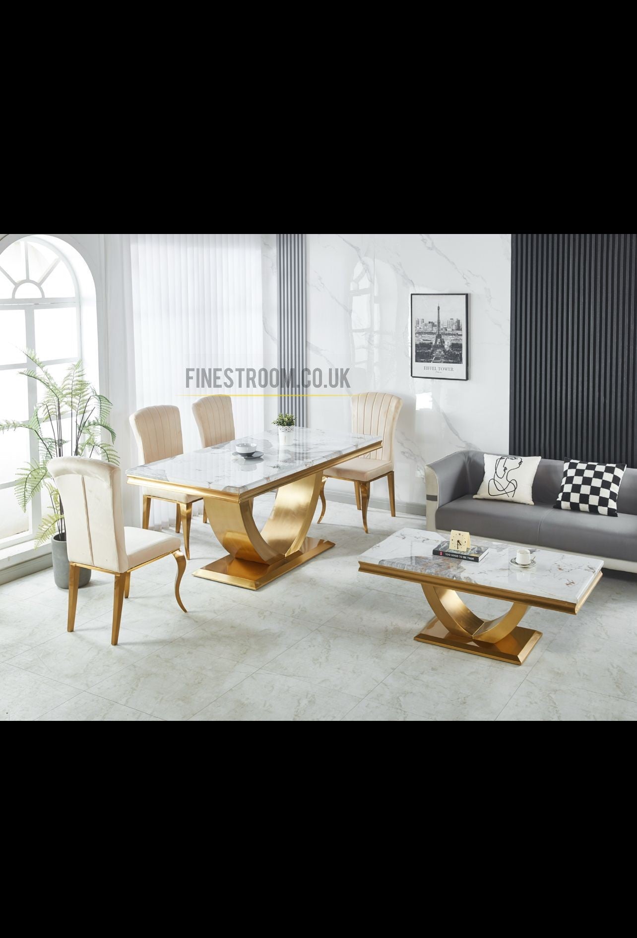 Elevate your dining space with the luxurious elegance of the Arial Gold Dining Table paired with Cream/Black Gold Nicole Chairs. This sophisticated dining set combines sleek modern design with timeless luxury, making it perfect for stylish everyday dining or hosting special occasions.