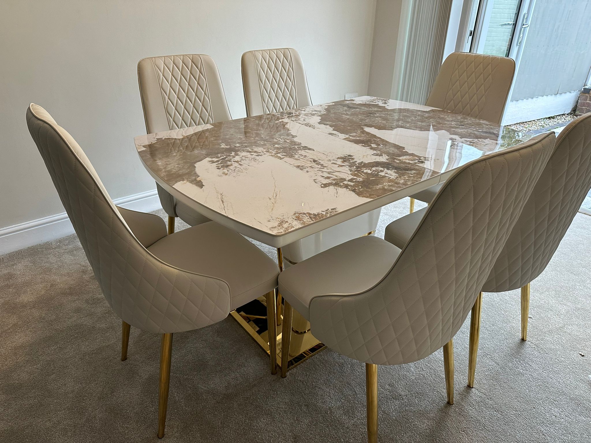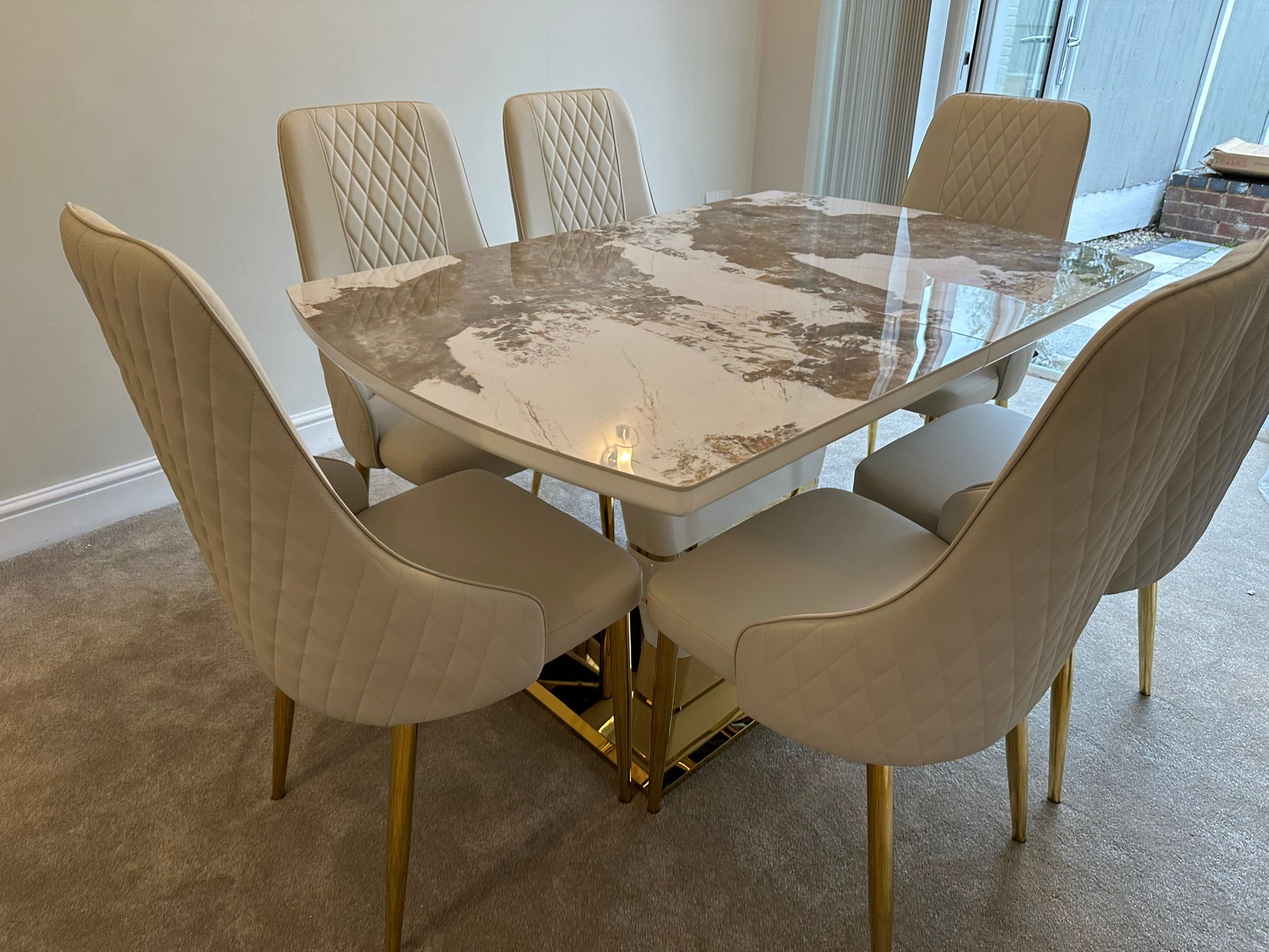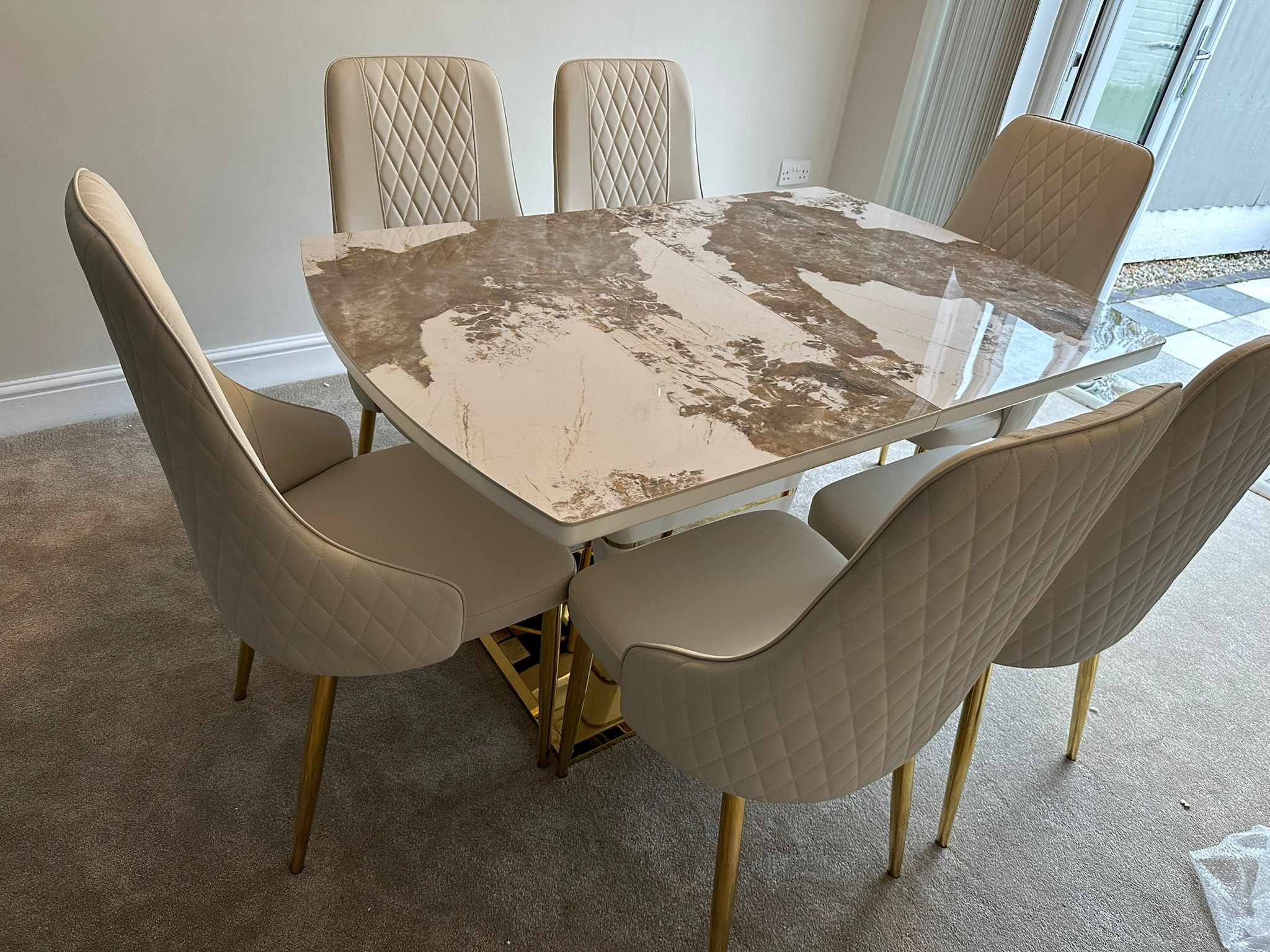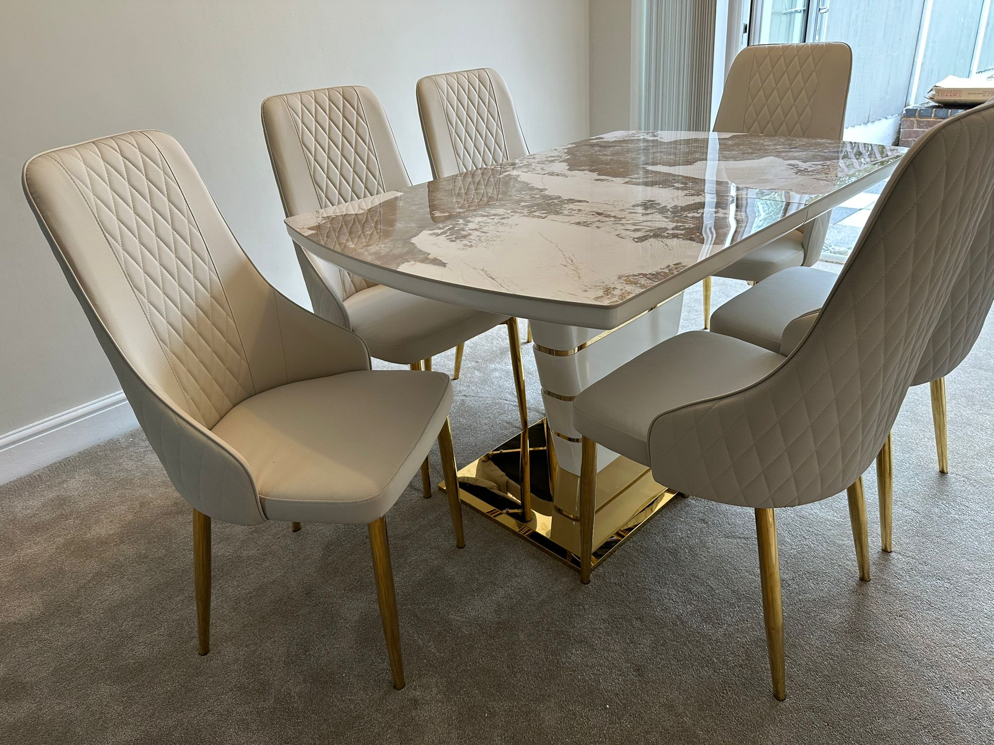 Redefine your dining experience with the Camden Pandora Extendable Sintered Stone Dining Table, paired effortlessly with our bold and modern Cream Lambo Chairs. This set combines high-end design with practical functionality, making it a perfect centerpiece for contemporary living. Whether you're enjoying everyday meals or entertaining guests, the Camden Extendable Dining Set brings together innovation, elegance, and comfort in one timeless design.