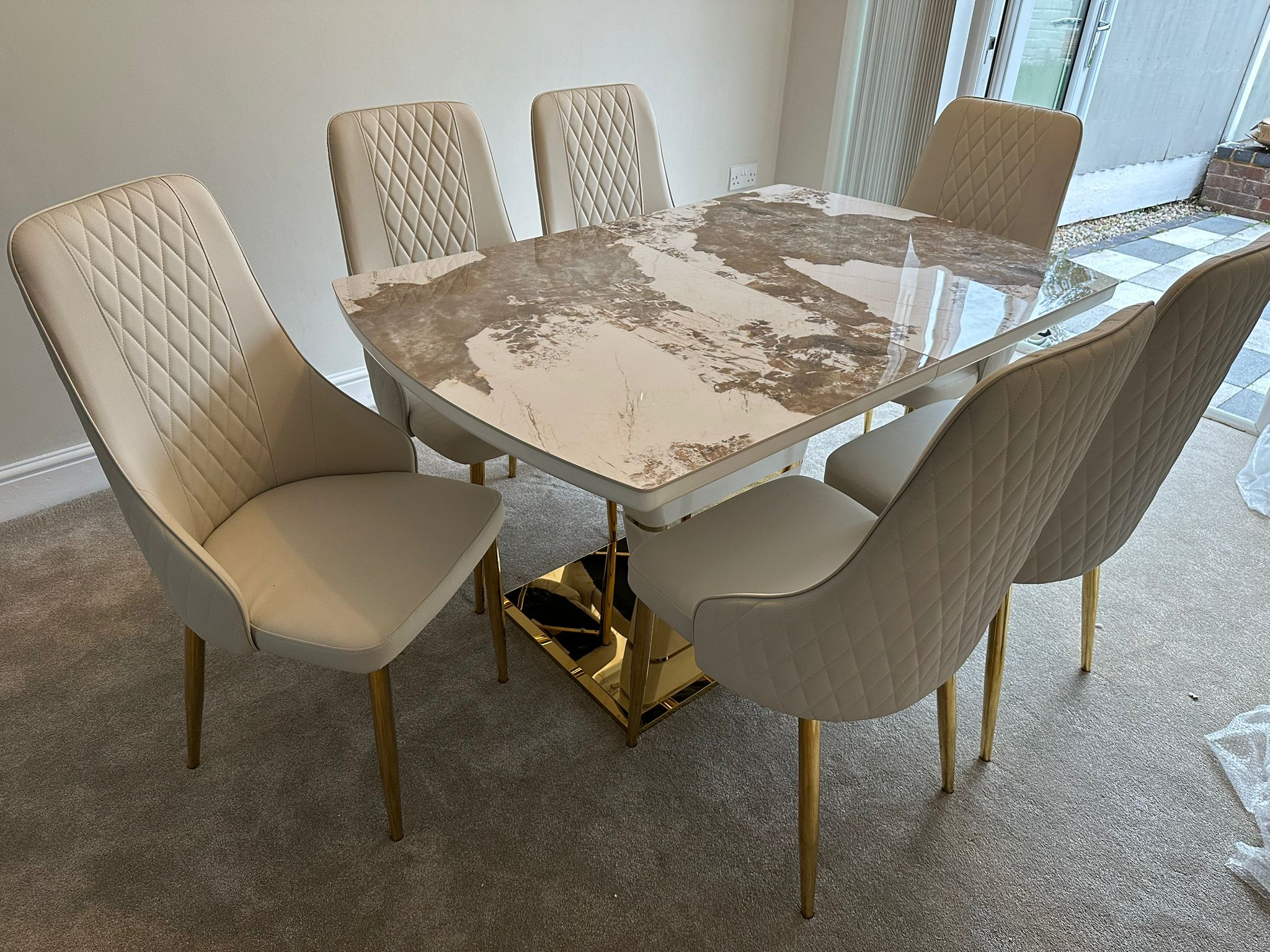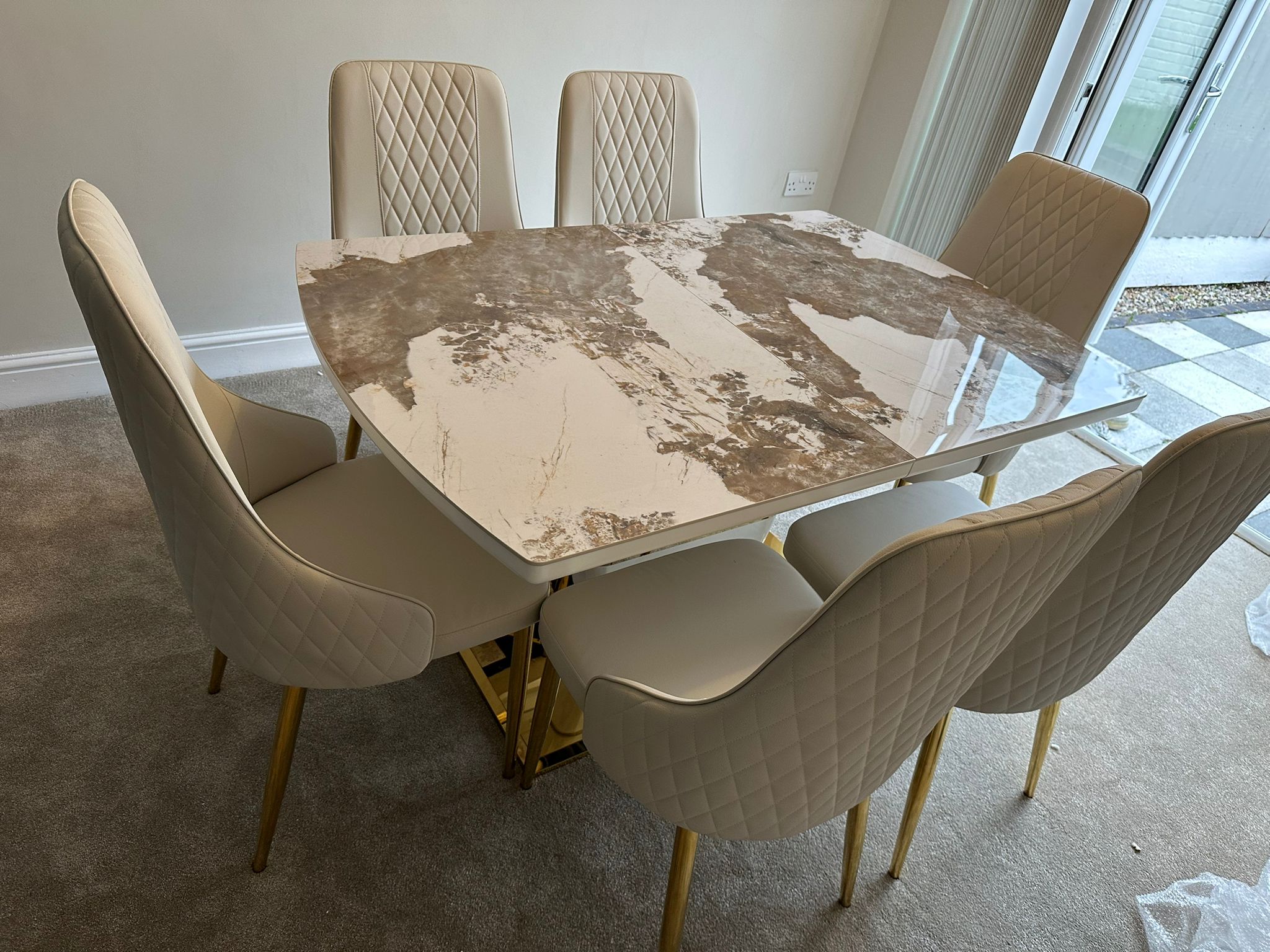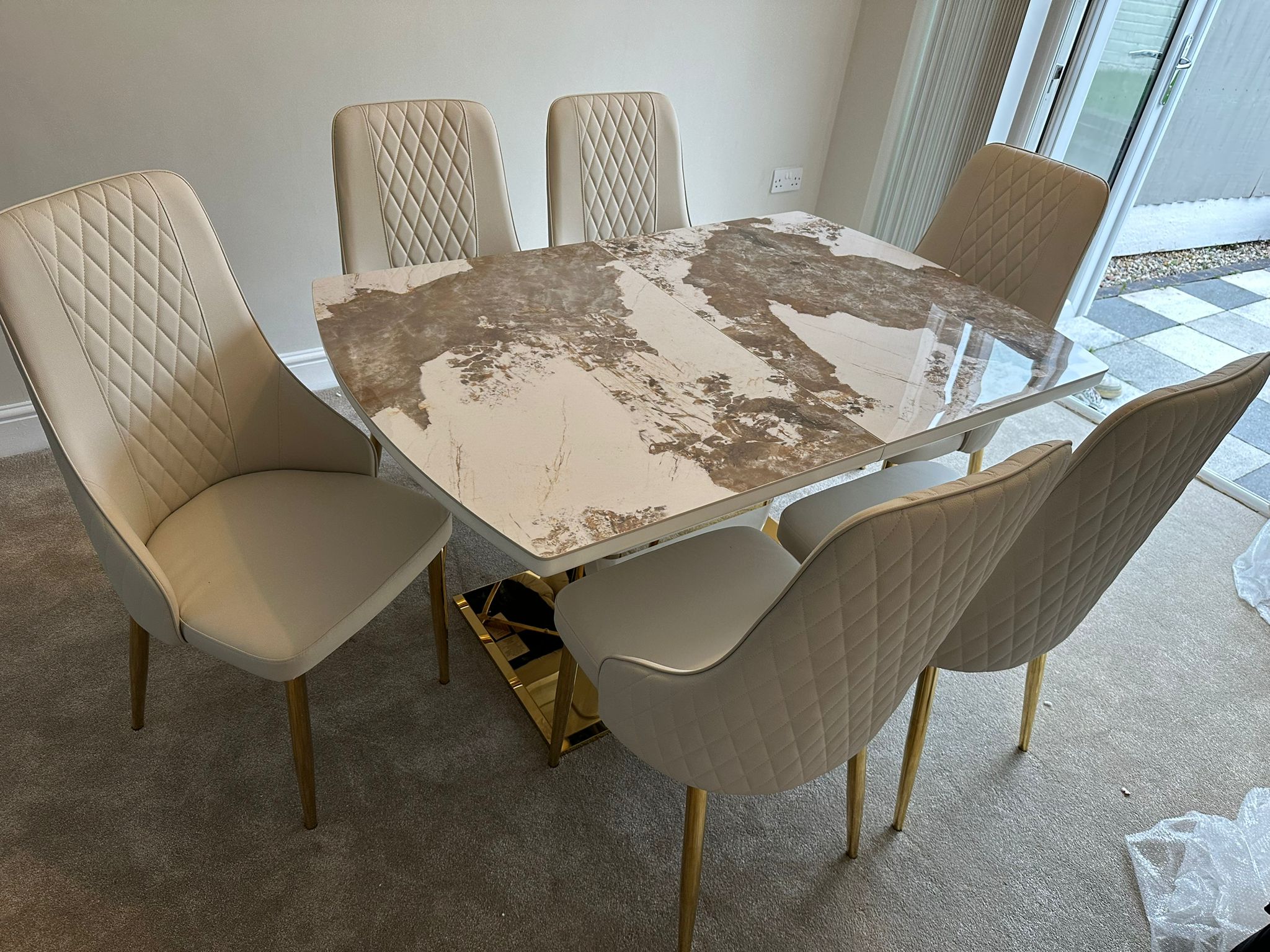 Redefine your dining experience with the Camden Pandora Extendable Sintered Stone Dining Table, paired effortlessly with our bold and modern Cream Lambo Chairs. This set combines high-end design with practical functionality, making it a perfect centerpiece for contemporary living. Whether you're enjoying everyday meals or entertaining guests, the Camden Extendable Dining Set brings together innovation, elegance, and comfort in one timeless design.