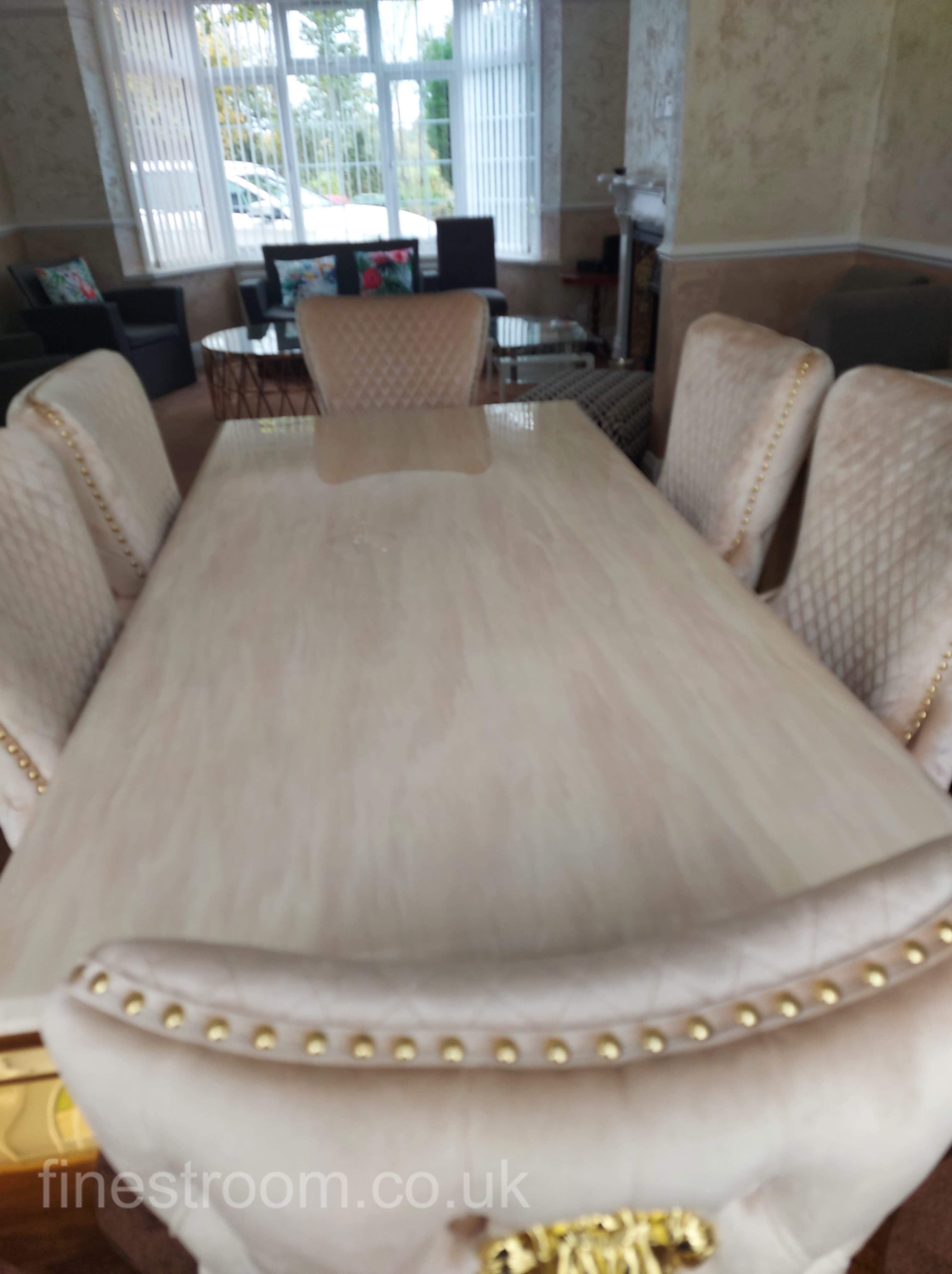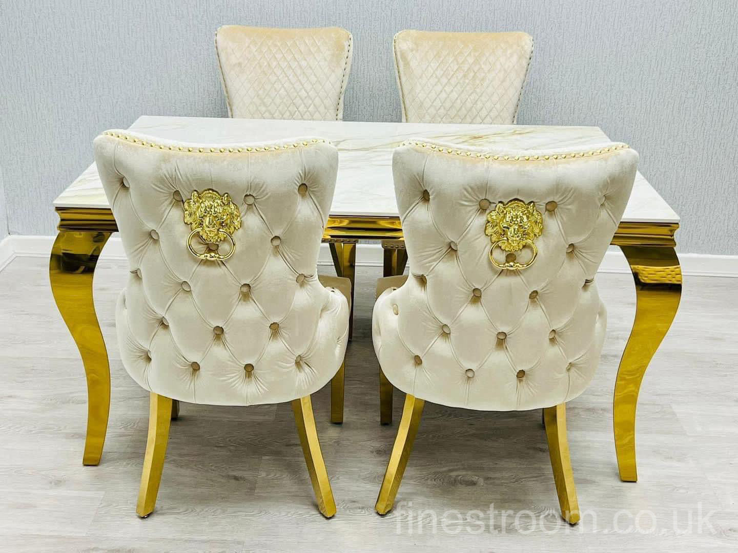 The Cream Gold Louis Dining Table with Cream Gold Lion Knocker Valentino Chairs is a stunning combination of classical elegance and royal opulence, designed to elevate any dining space. Together, the Cream Gold Louis Dining Table with Cream Gold Lion Knocker Valentino Chairs brings sophistication and timeless charm to your home, offering an unparalleled blend of beauty, comfort, and luxury.