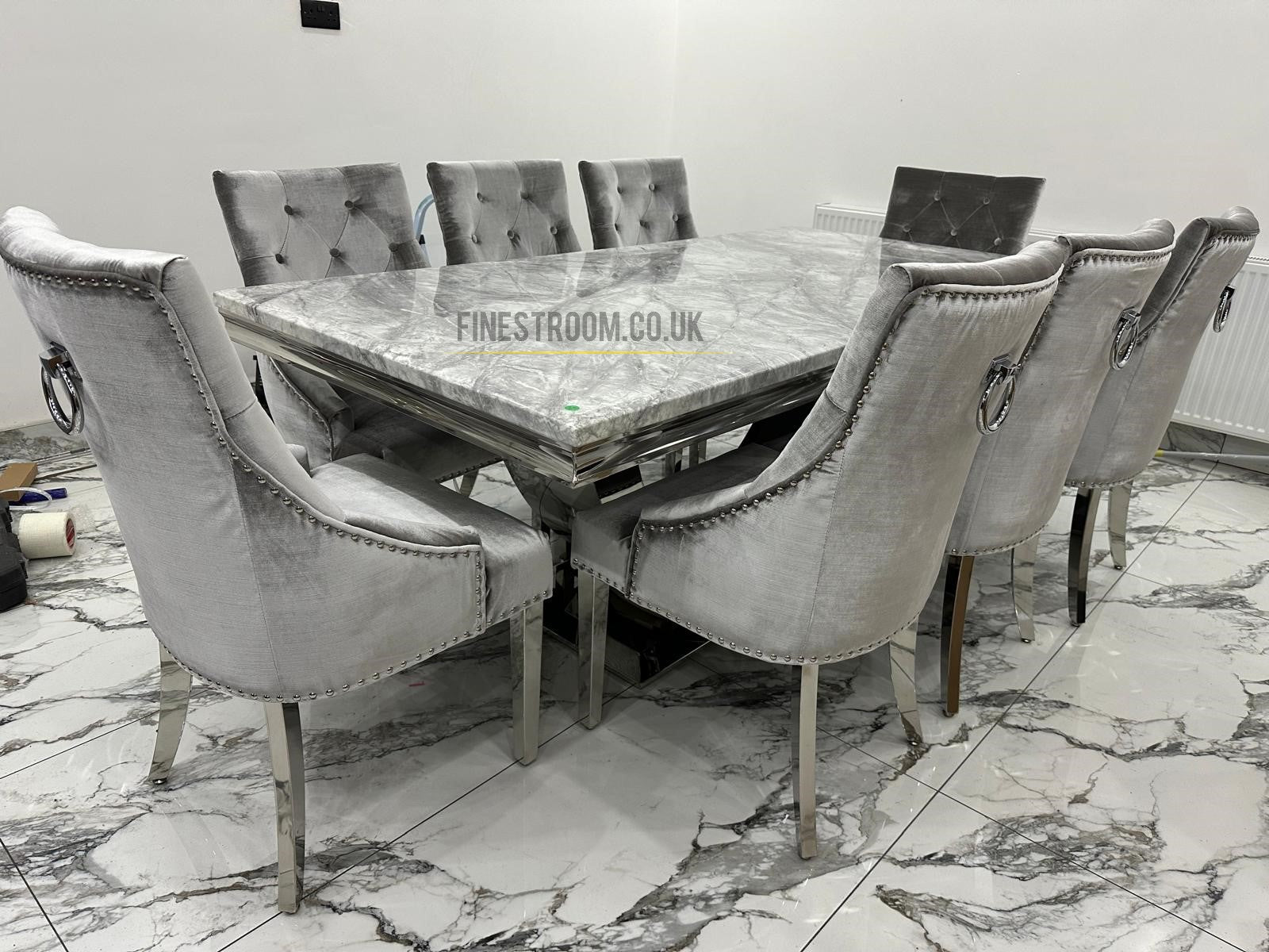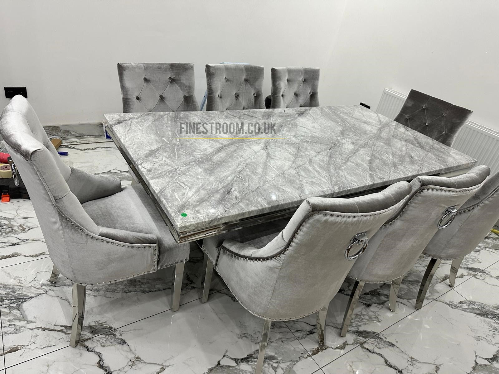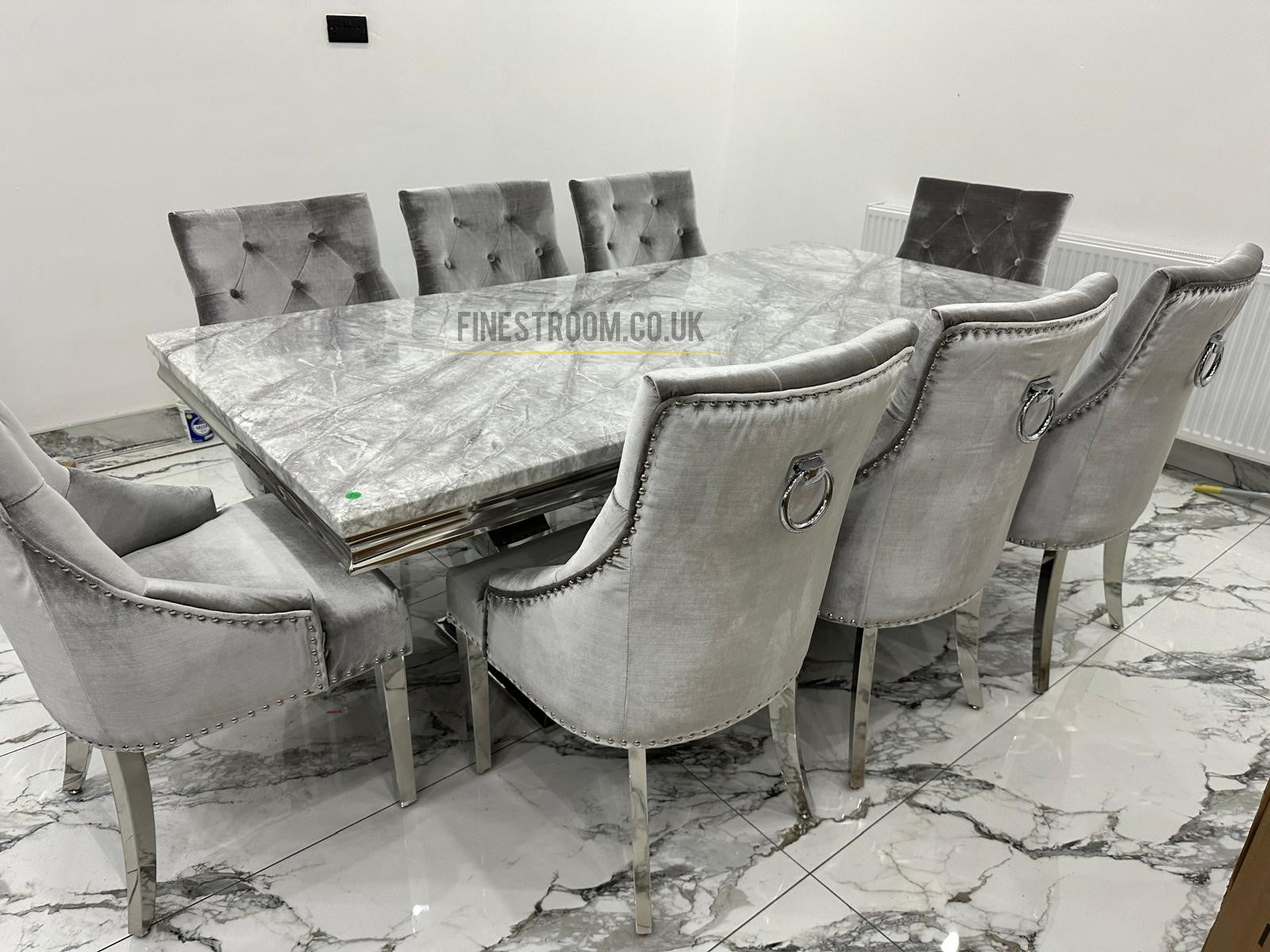 Introduce modern elegance into your dining space with the Grey Arial Dining Table paired with Silver Valencia RK Chairs.
