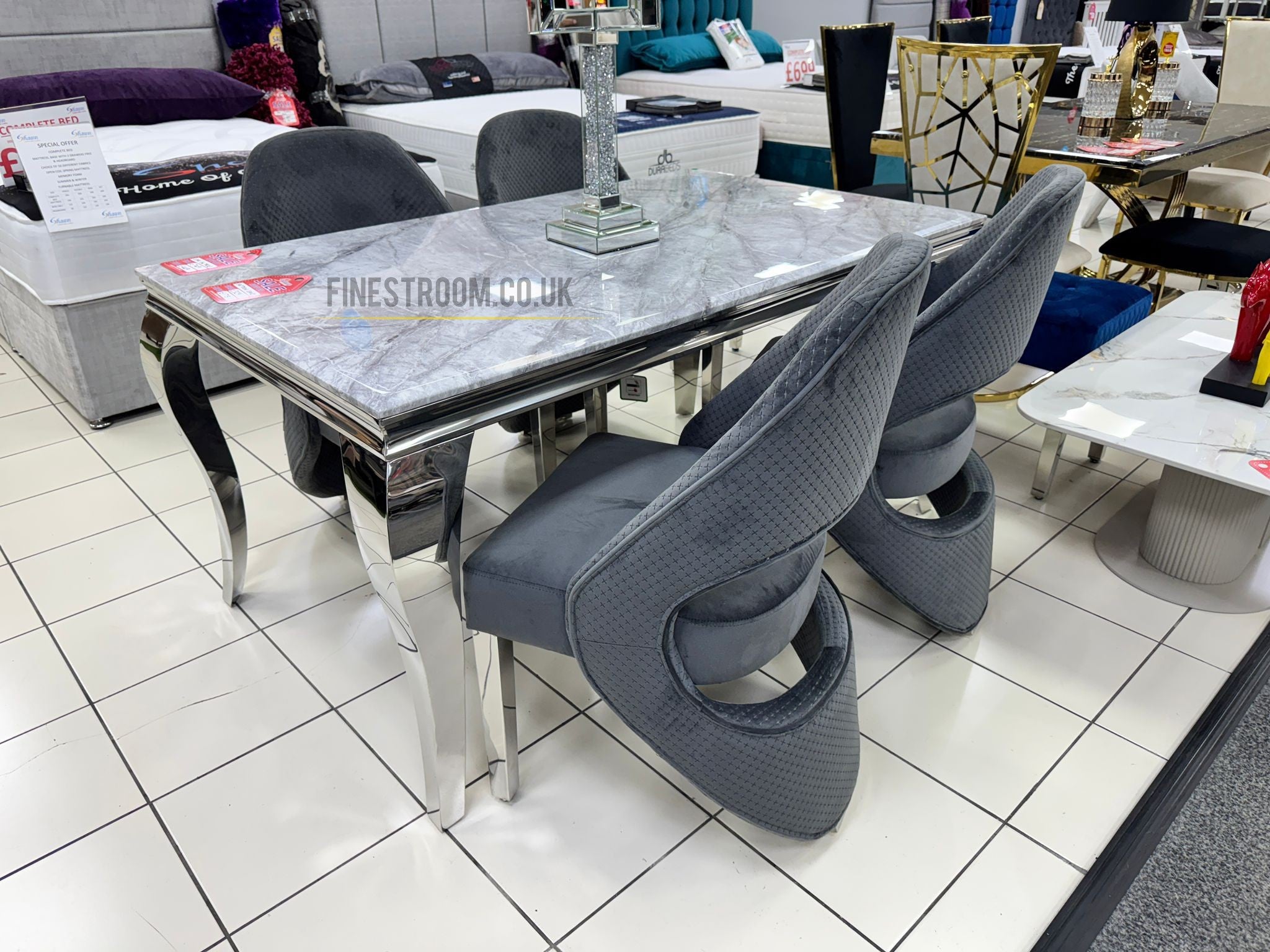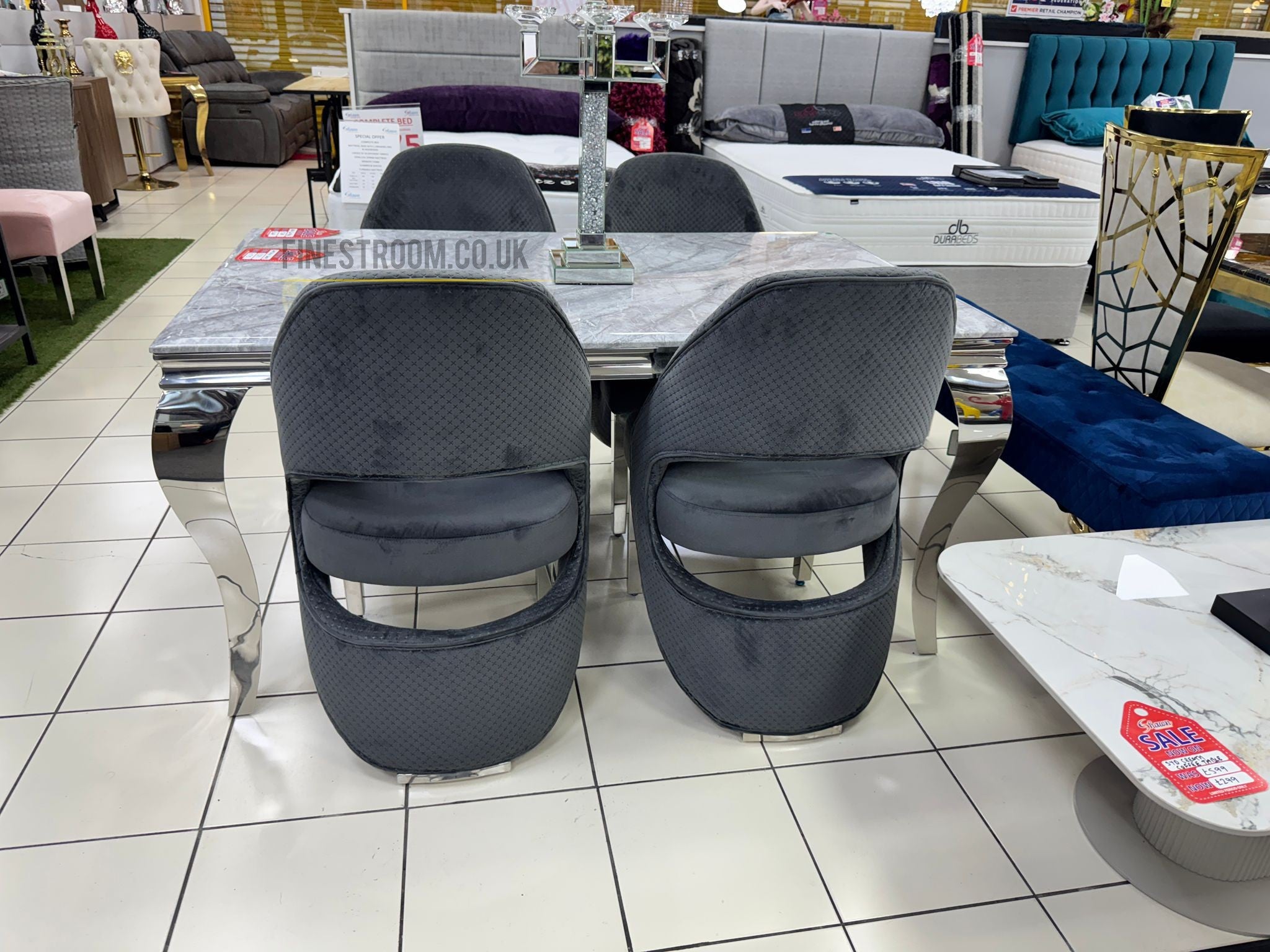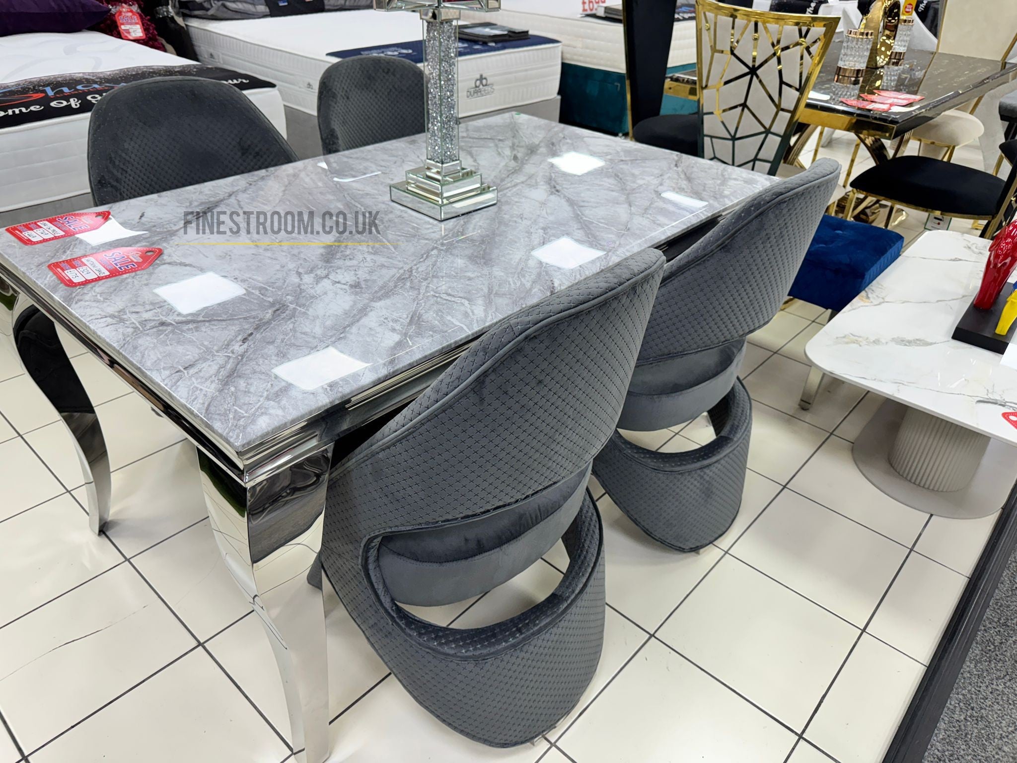 Elevate your dining space with the modern sophistication of the Grey Louis Chrome Dining Table paired with Grey Santorini Chairs. Designed to blend luxury with everyday practicality, this set brings contemporary elegance to any home.