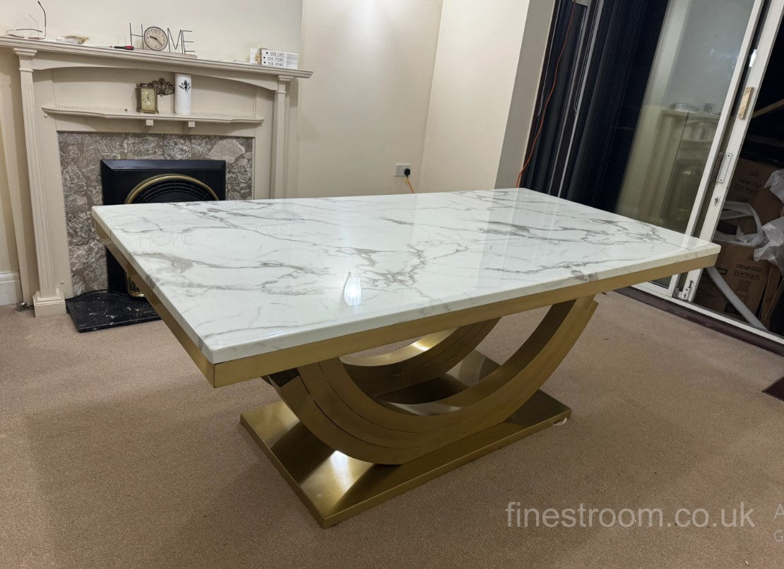 The Monaco Gold Dining Table is a stunning centerpiece that exudes modern glamour and refined sophistication. Designed to make a statement, it features a luxurious gold-finished base paired with a sleek tabletop, creating a perfect harmony of elegance and contemporary style.