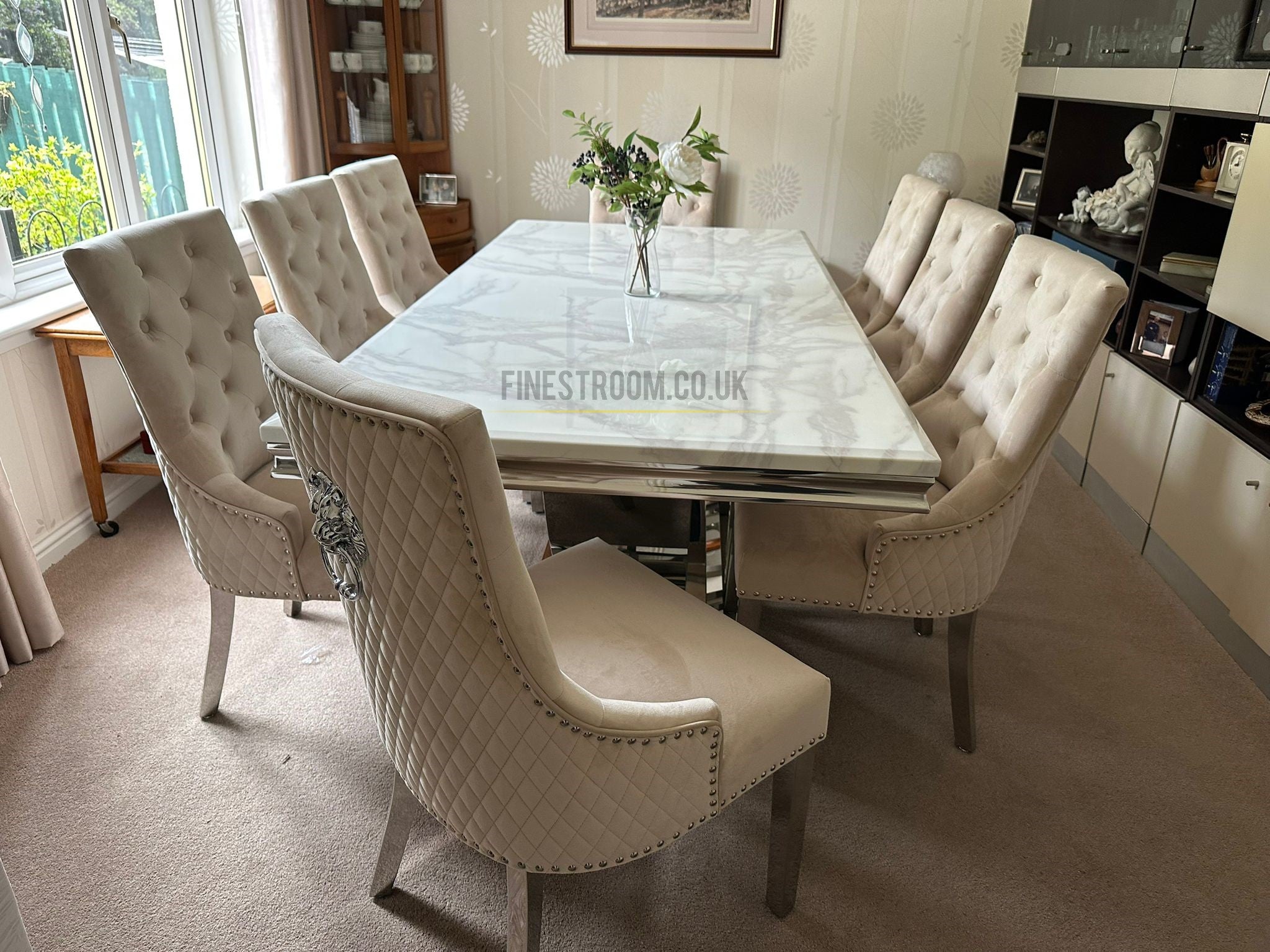 Bring timeless elegance and contemporary glamour to your dining room with the White Arial Dining Table paired with Mink Majestic Lion Knocker Chairs. This luxurious combination blends modern sophistication with classic detailing, creating a show-stopping centerpiece for your home.